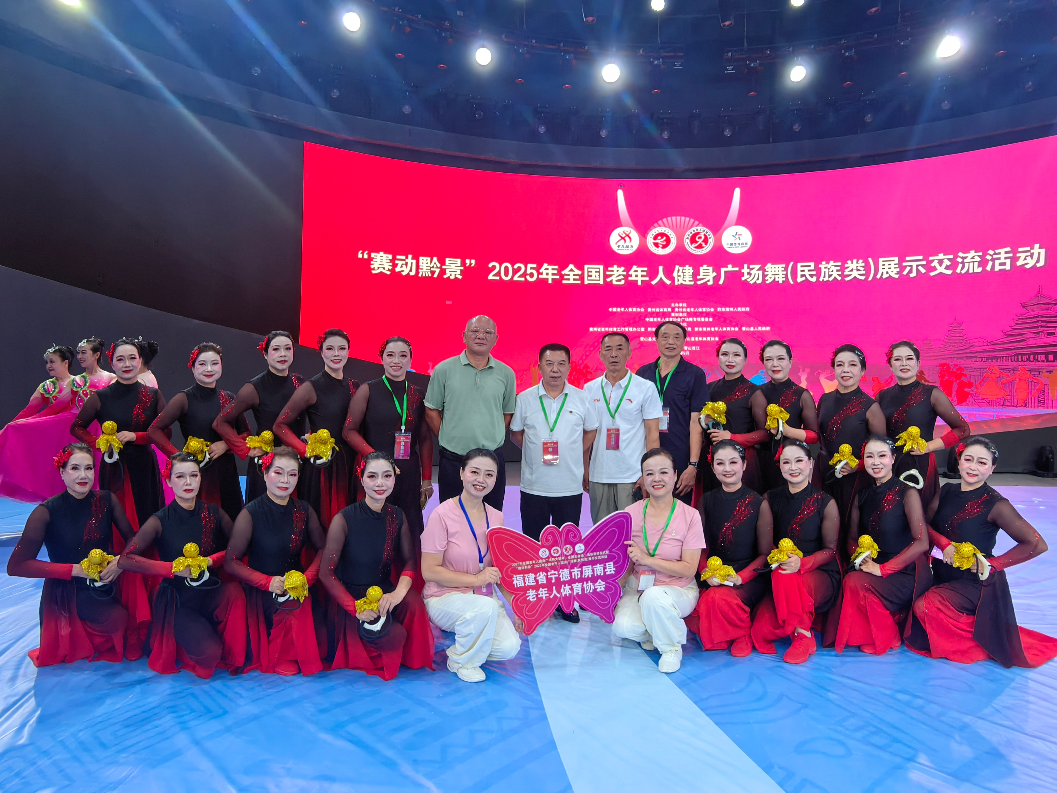 9月12至16日,由中国老体协、贵州省体育局等单位共同主办的“赛动黔景”2025年全国老年人健身广场舞(民族类)展示交流活动在贵州省黔东南苗族侗族自治州雷山县西江镇举行。来自福建、山西、四川、云南、黑龙江等省区市21支代表队、近400名银发选手欢聚一堂。屏南县老体协夕阳红艺术团的《中国红》以健身球为道具,融入秧歌与现代舞元素,把健身球操的刚健活力诠释出来,巧妙融入民族舞蹈的柔美韵味,展示出老年人矍铄的精神面貌与精湛的技艺水准,赢得了评选专家与现场观众的广泛好评,获得团体奖。